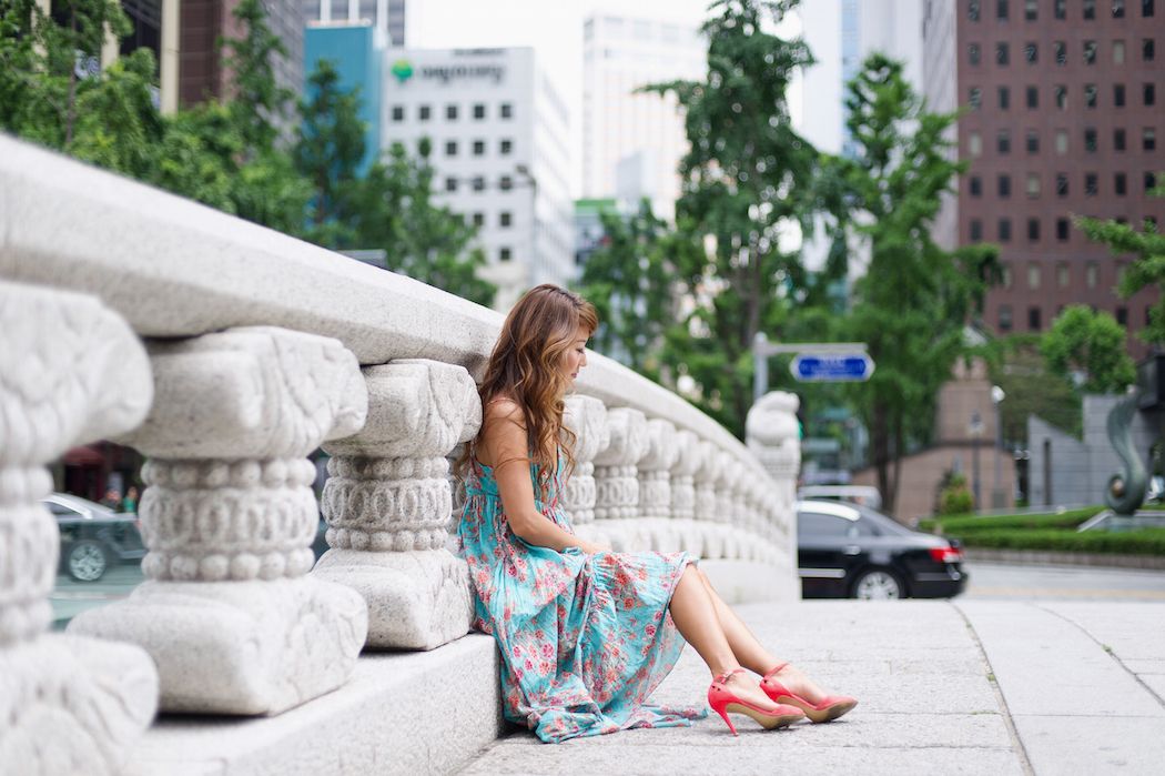 It was a clear summer day in Seoul with a fresh breeze right after the rain. Good conditions to play around with my dress in the wind. We headed to the Cheonggyecheon Stream to shoot at the marble bridge, which is only one of 20 beautiful bridges that crosses the stream. Cheonggyecheon Stream was restored in 2005 and it has been transformed into a haven of natural beauty amidst the bustle of city life. There are festivals and events all year round and when you leisurely stroll along the stream you will easily find major tourist sites like Deoksugung Palace, Seoul Plaza, the Sejong Center, Insa-dong Street, Changdeokgung Palace, and Changgyeonggung Palace close to the path. Don’t miss it when you are in Seoul. Makes a great shooting location with a modern backdrop of the skyline mixed with traditional Korean architecture like the marble bridge.